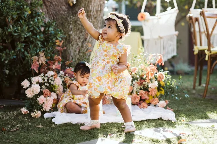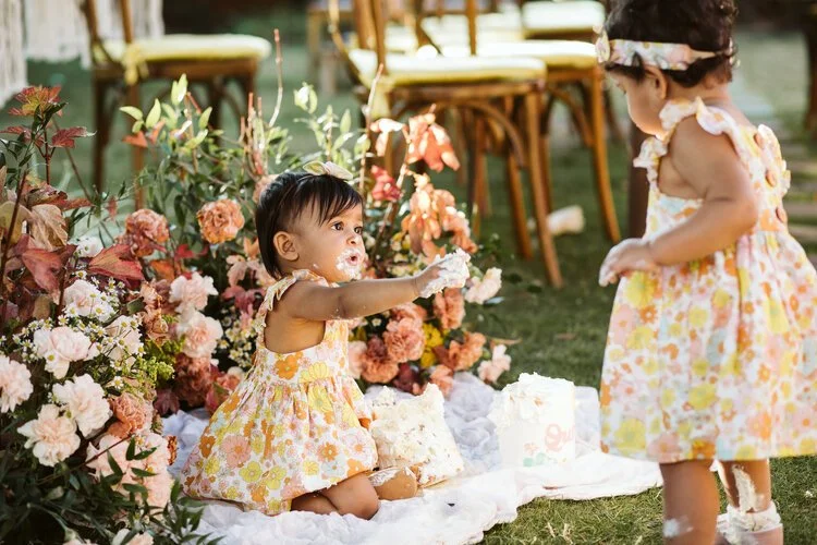 Muneera contacted me to take photos of her daughter and niece's double 1st Birthday Party at her Los Angeles residence. We discussed the vibes of the party, the theme and all the little details a good photographer sniffs out before showing up and clicking away. I had a feeling it would look fantastic and upon arrival, I was wowed by every little detail: the garden decor, matching outfits, and the groovy 70's touches.