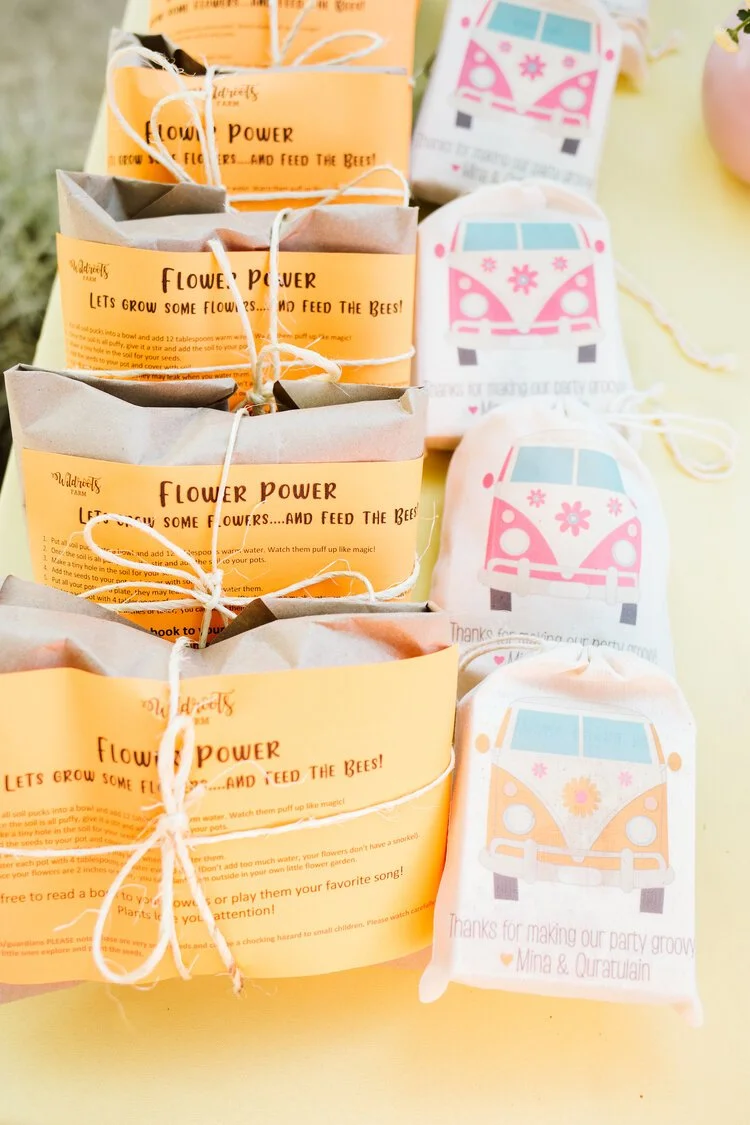 And I have to mention, finding party favors that will actually get used, won't create waste, and match the theme of the party is a tall order. But a they took this Flower Power 1st Birthday Party as a chance to invite guests to plant some flowers - the party favors include wildflower seeds!