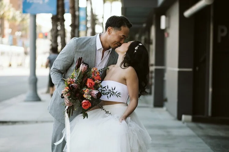 Another pose that is perfect for couples with a noticeable height difference is a classic pose that we’ve all seen in magazines and movies: the magic bend (also called “the dip” - see below). This pose looks so natural and easy for people with a height difference.