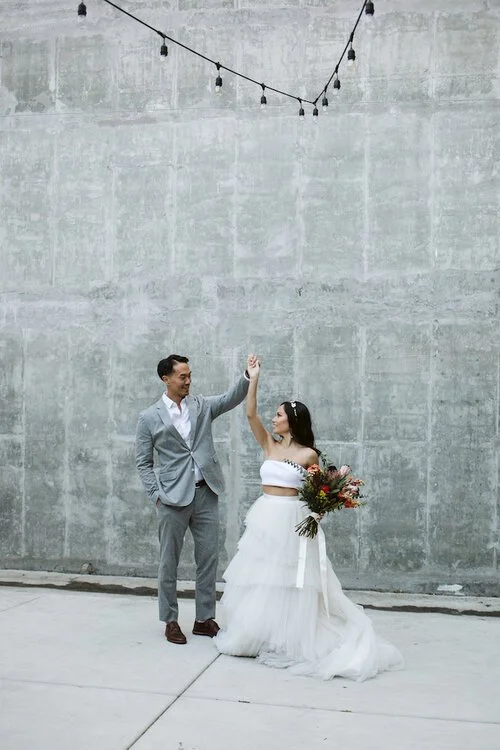 Bending the knees is only a good look when done right (see David just below!). Usually I recommend hiding your legs behind your partner’s outfit (hello ballroom dress or skirts!) or you can always crop your shots! A little split (wider stance) can work wonders too and is more comfortable than bent knees. Whatever works for you, go with it!