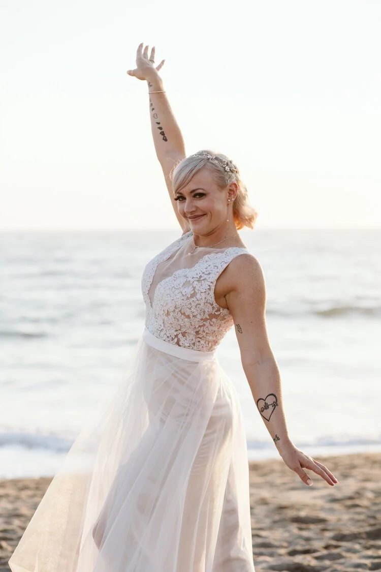 Sara’s got ready with her daughter, who made her hairstyle. She found her beautiful (and sexy!) beach wedding dress in a thrift shop. It was meant to be… I love how romantic the dress is, and let her gorgeous tattoos show!